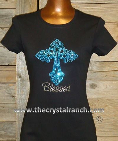 Blessed rhinestone design in clear and your choice of rhinestone color for the cross.